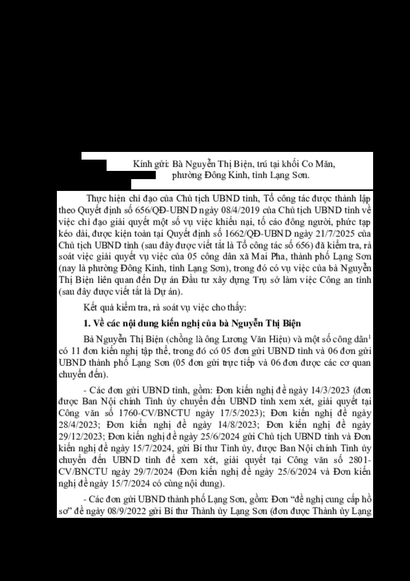Thông báo về việc chấm dứt thụ lý giải quyết vụ việc của bà Nguyễn Thị Biện, trú tại thôn Co Măn, xã Mai Pha, thành phố Lạng Sơn (nay là khối Co Măn, phường Đông Kinh, tỉnh Lạng Sơn)