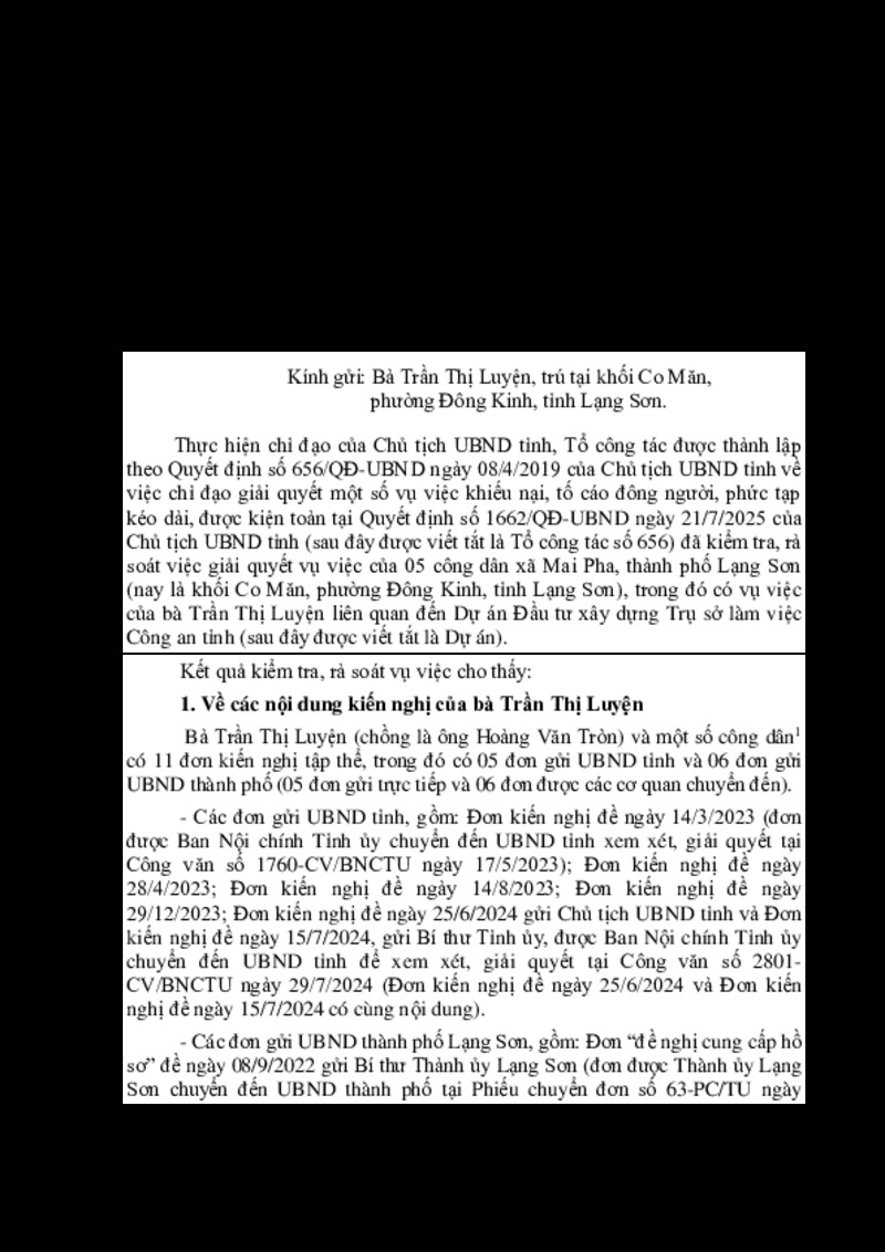 Thông báo về việc chấm dứt thụ lý giải quyết vụ việc của bà Trần Thị Luyện trú tại thôn Co Măn, xã Mai Pha, thành phố Lạng Sơn (nay là khối Co Măn, phường Đông Kinh, tỉnh Lạng Sơn)