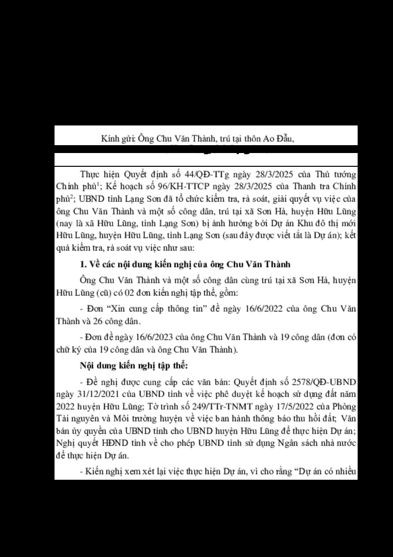 Về việc chấm dứt thụ lý giải quyết vụ việc của ông Chu Văn Thành, xã Hữu Lũng, tỉnh Lạng Sơn