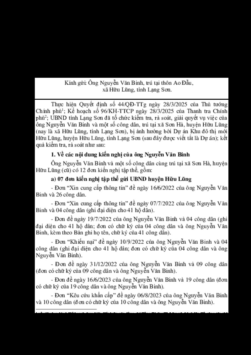 Về việc chấm dứt thụ lý giải quyết vụ việc của ông Nguyễn Văn Binh, xã Hữu Lũng, tỉnh Lạng Sơn