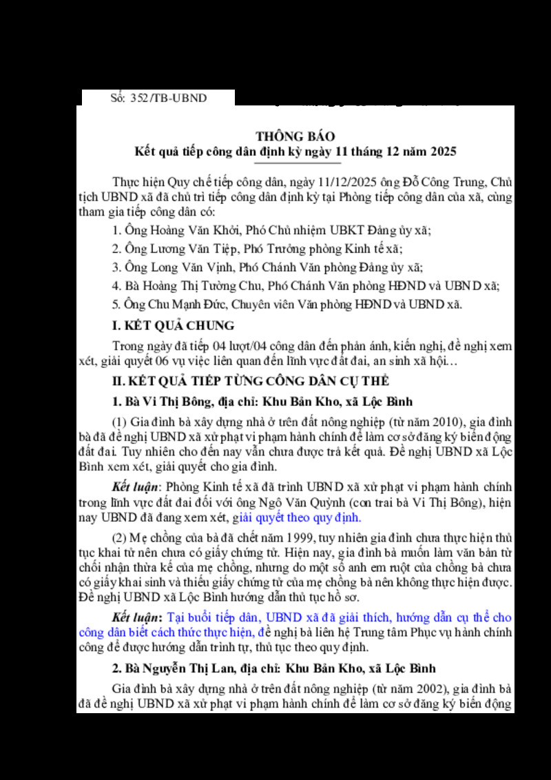 Kết quả tiếp công dân định kỳ ngày 11 tháng 12 năm 2025 của Chủ tịch UBND xã Lộc Bình