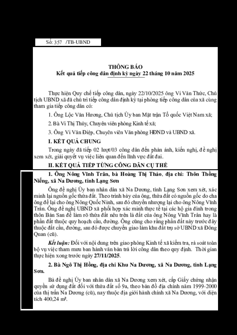 Kết quả tiếp công dân định kỳ ngày 22 tháng 10 năm 2025 của Chủ tịch UBND xã Na Dương