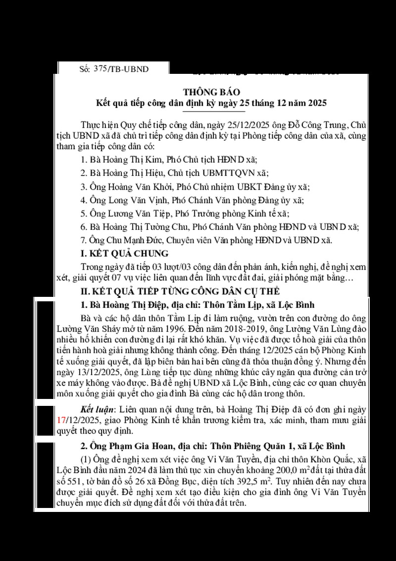 Kết quả tiếp công dân định kỳ ngày 25 tháng 12 năm 2025 của Chủ tịch UBND xã Lộc Bình