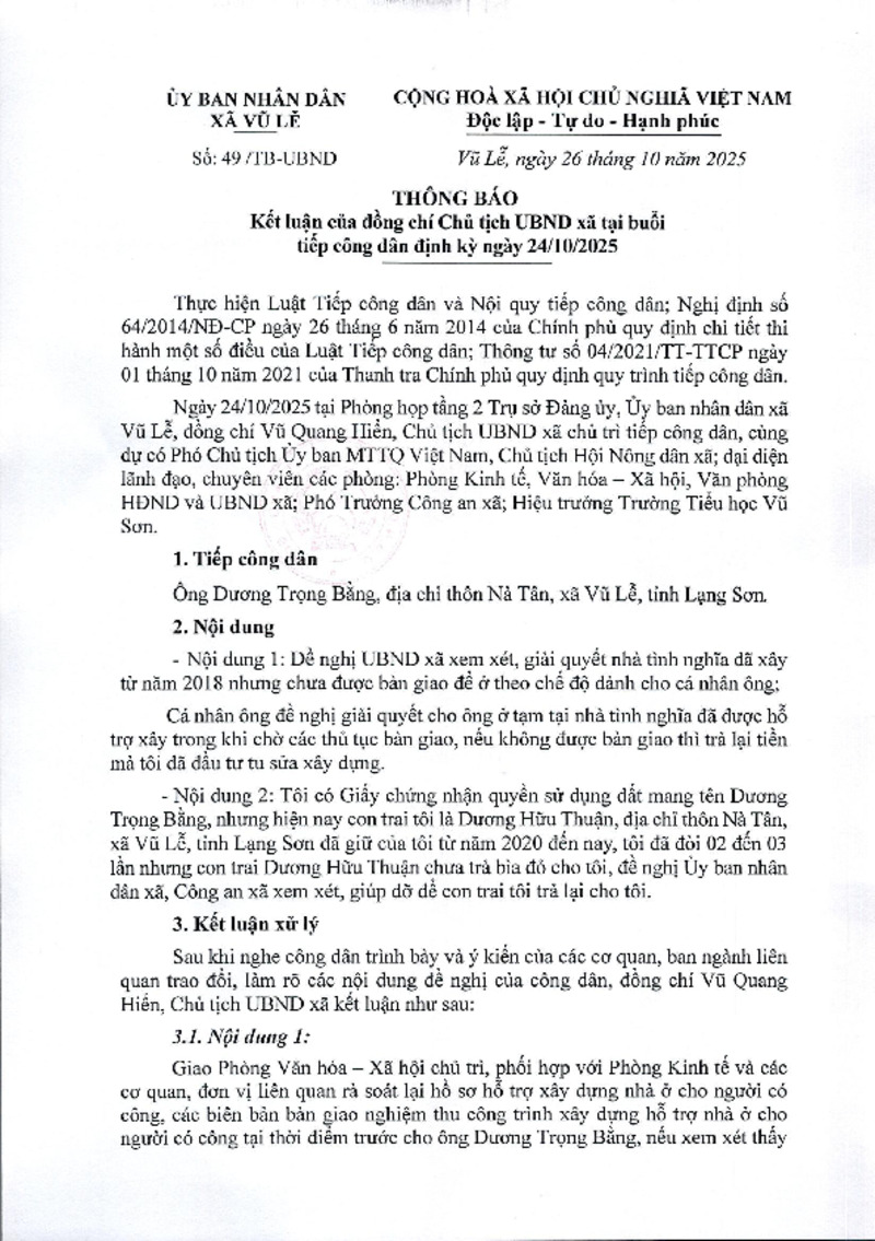 Thông báo kết luận của đồng chí Chủ tịch UBND xã Vũ Lễ tại buổi tiếp công dân định kỳ ngày 24/10/2025.