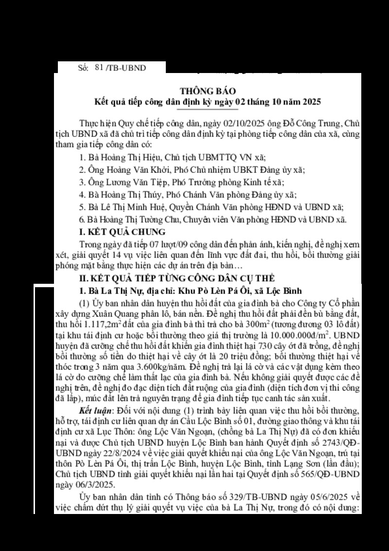 Kết quả tiếp công dân định kỳ ngày 02 tháng 10 năm 2025 của Chủ tịch UBND xã Lộc Bình