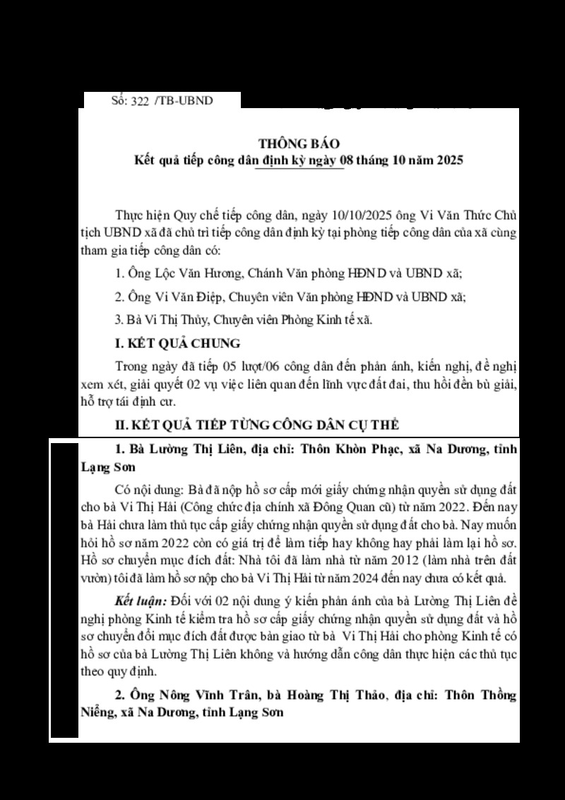 Kết quả tiếp công dân định kỳ ngày 08 tháng 10 năm 2025 của Chủ tịch UBND xã Na Dương