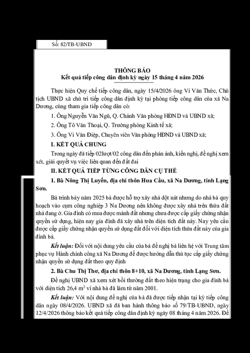Kết quả tiếp công dân định kỳ ngày 15 tháng 4 năm 2026 của Chủ tịch UBND xã Na Dương