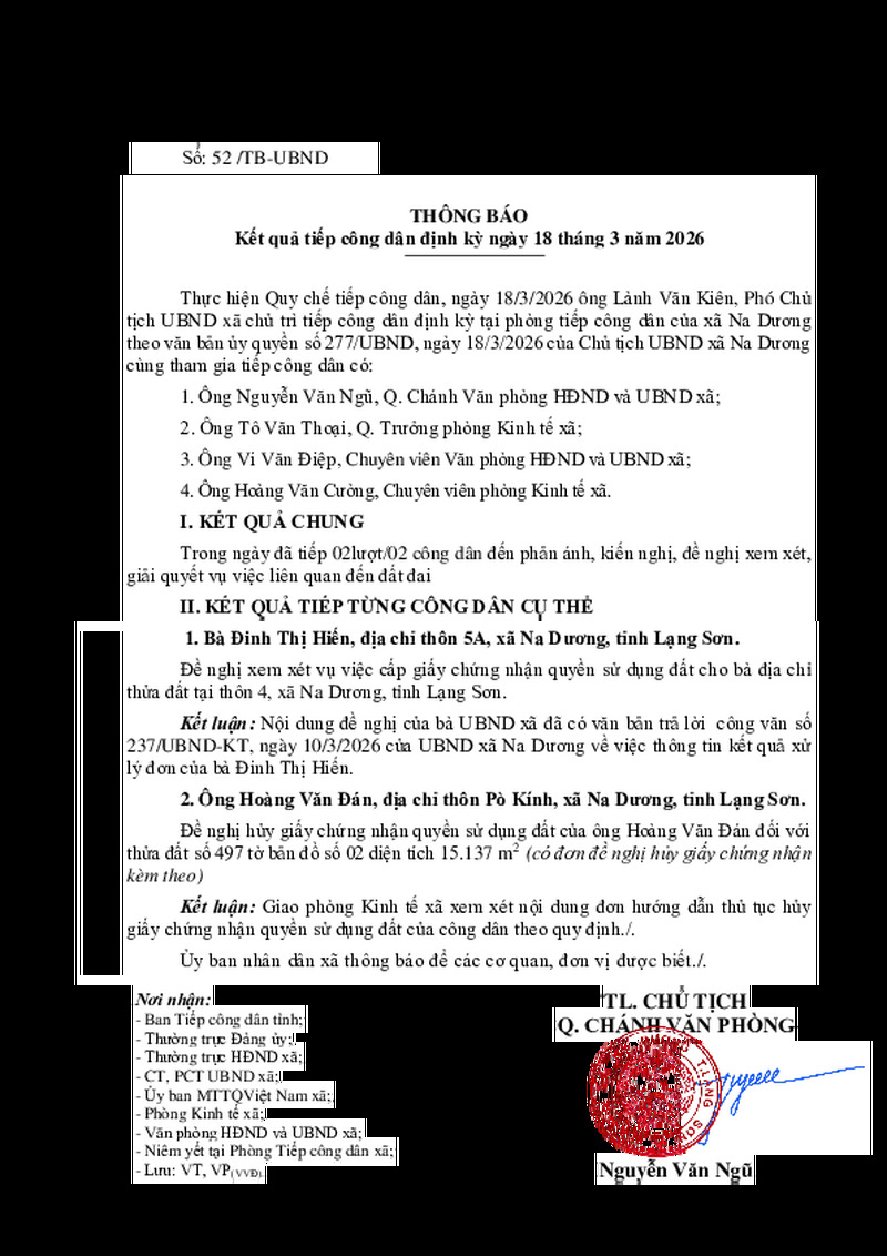 Kết quả tiếp công dân định kỳ ngày 18 tháng 3 năm 2026 của Chủ tịch UBND xã Na Dương