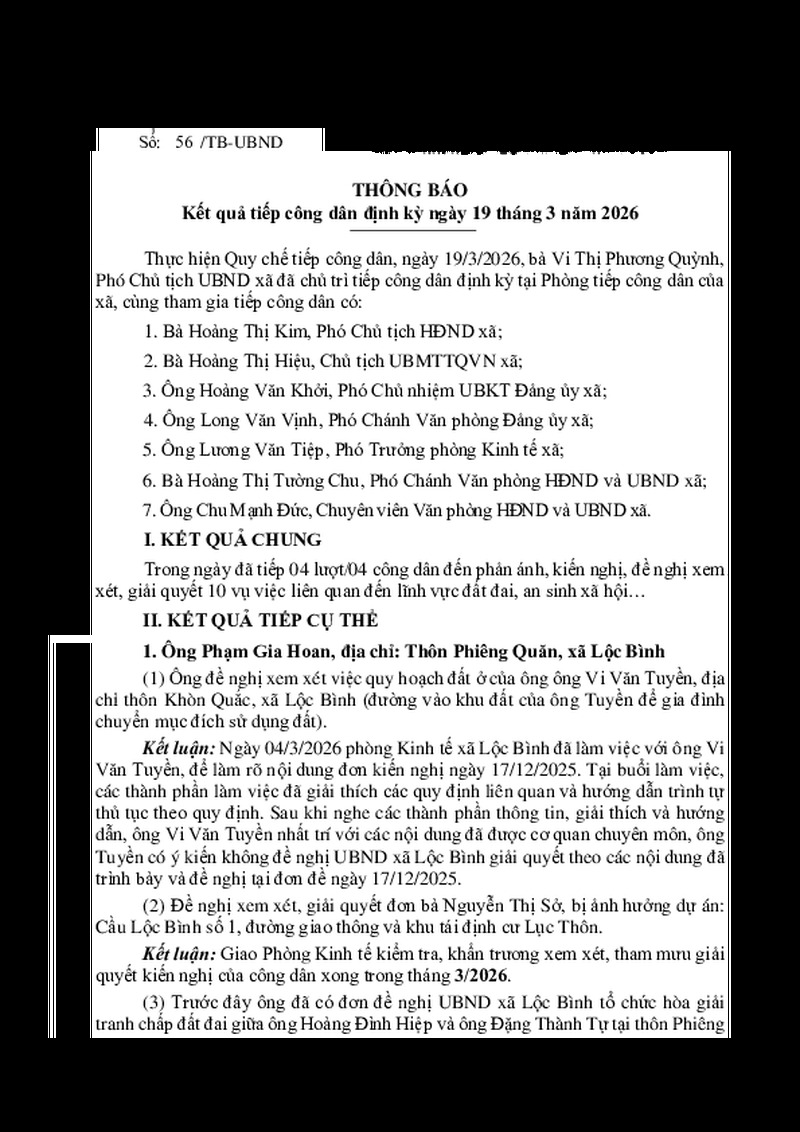 Kết quả tiếp công dân định kỳ ngày 19 tháng 3 năm 2026 của Chủ tịch UBND xã Lộc Bình