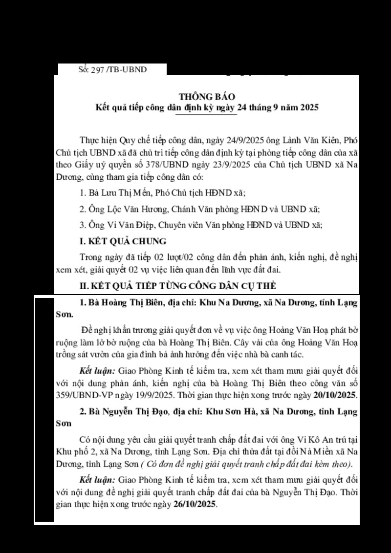 Kết quả tiếp công dân định kỳ ngày 24 tháng 9 năm 2025 của UBND xã Na Dương