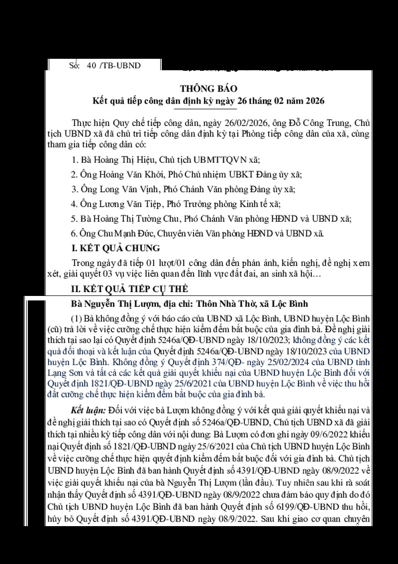 Kết quả tiếp công dân định kỳ ngày 26 tháng 02 năm 2026 của Chủ tịch UBND xã Lộc Bình