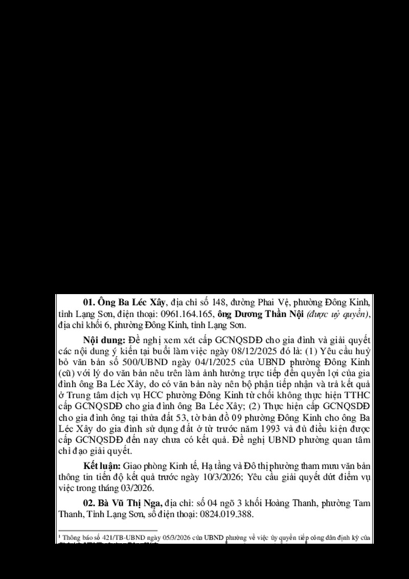 Thông báo kết quả tiếp công dân định kỳ ngày 05/3/2026 của Chủ tịch UBND phường Đông Kinh